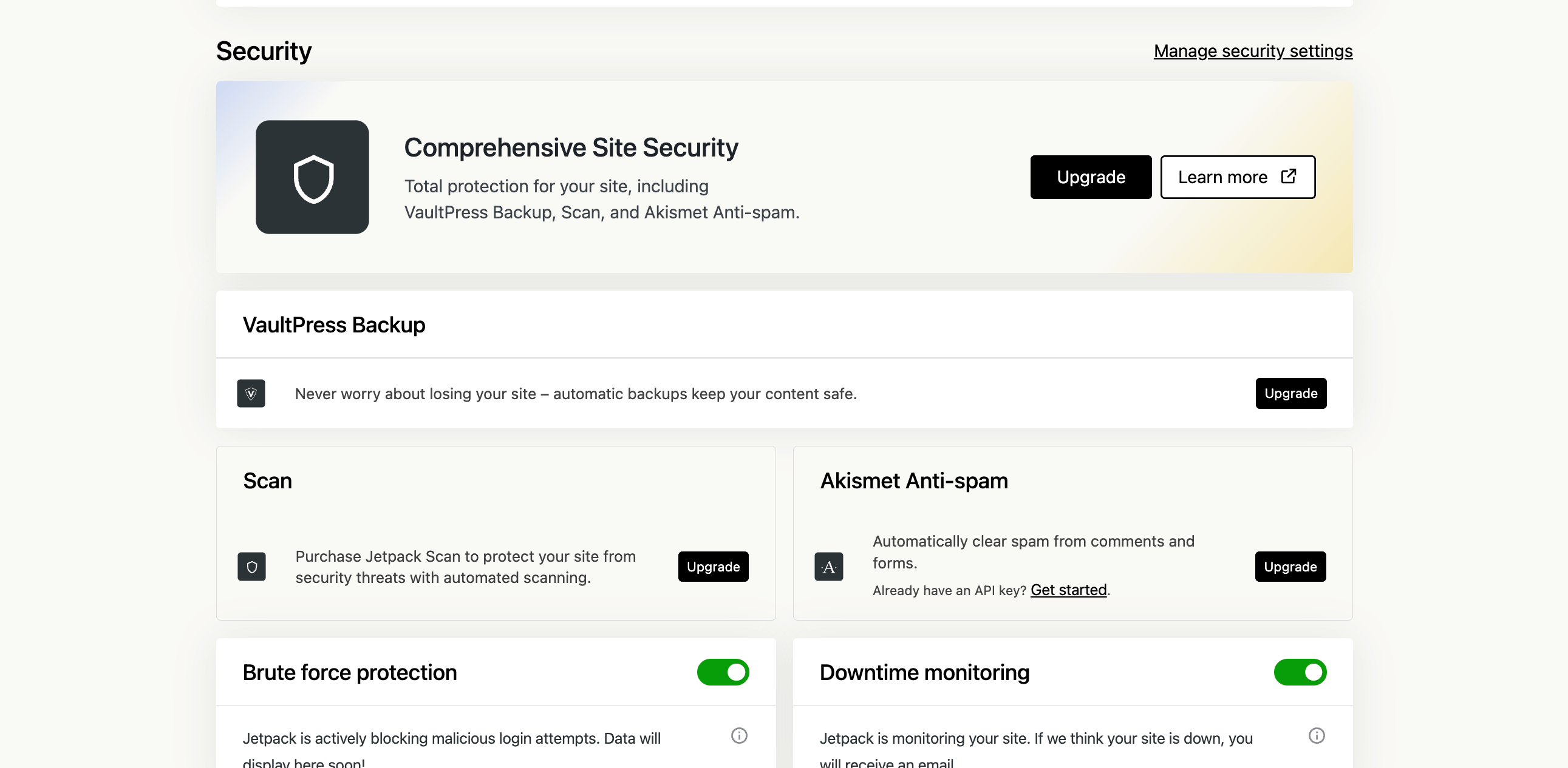 Advanced features come at an additional cost. $9.95/mo first year ($19.95 after) per site for Security features like real-time backups (10GB), malware scanning, Akismet.