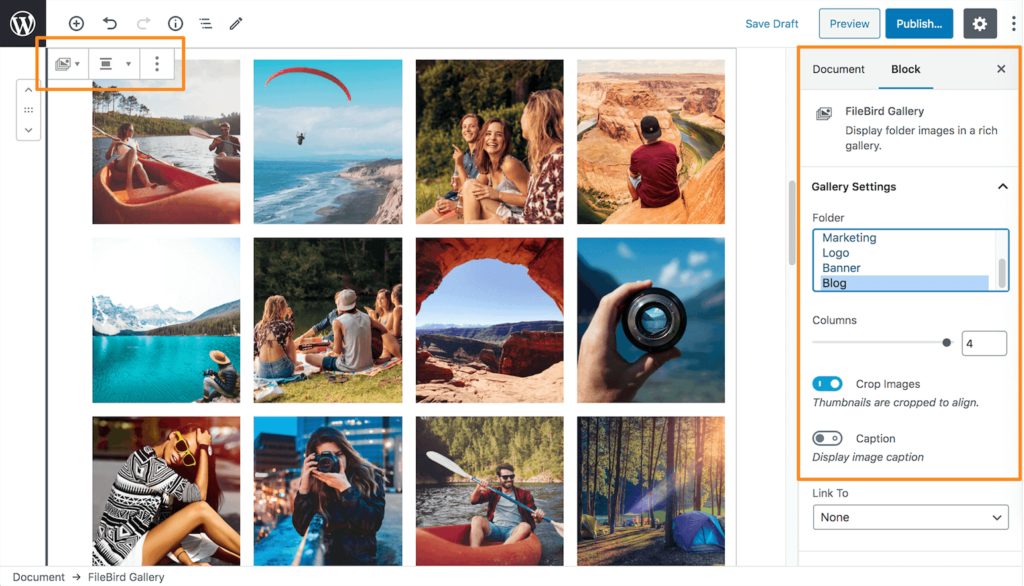 In the Gutenberg editor, you can add a block of FileBird gallery to insert multiple media files at once. By picking a particular folder, you are displaying its media content to showcase on the page, post, and custom post type, with or without caption.
