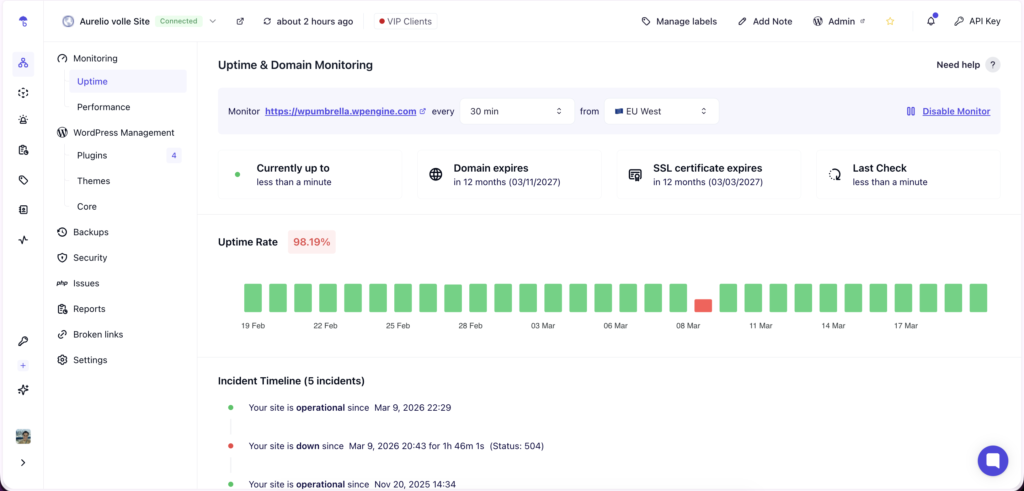 Sie können ein Tool wie WP Umbrella verwenden, um die Leistung all Ihrer Websites über ein einziges Dashboard zu überwachen und benachrichtigt zu werden, wenn etwas schiefgeht.